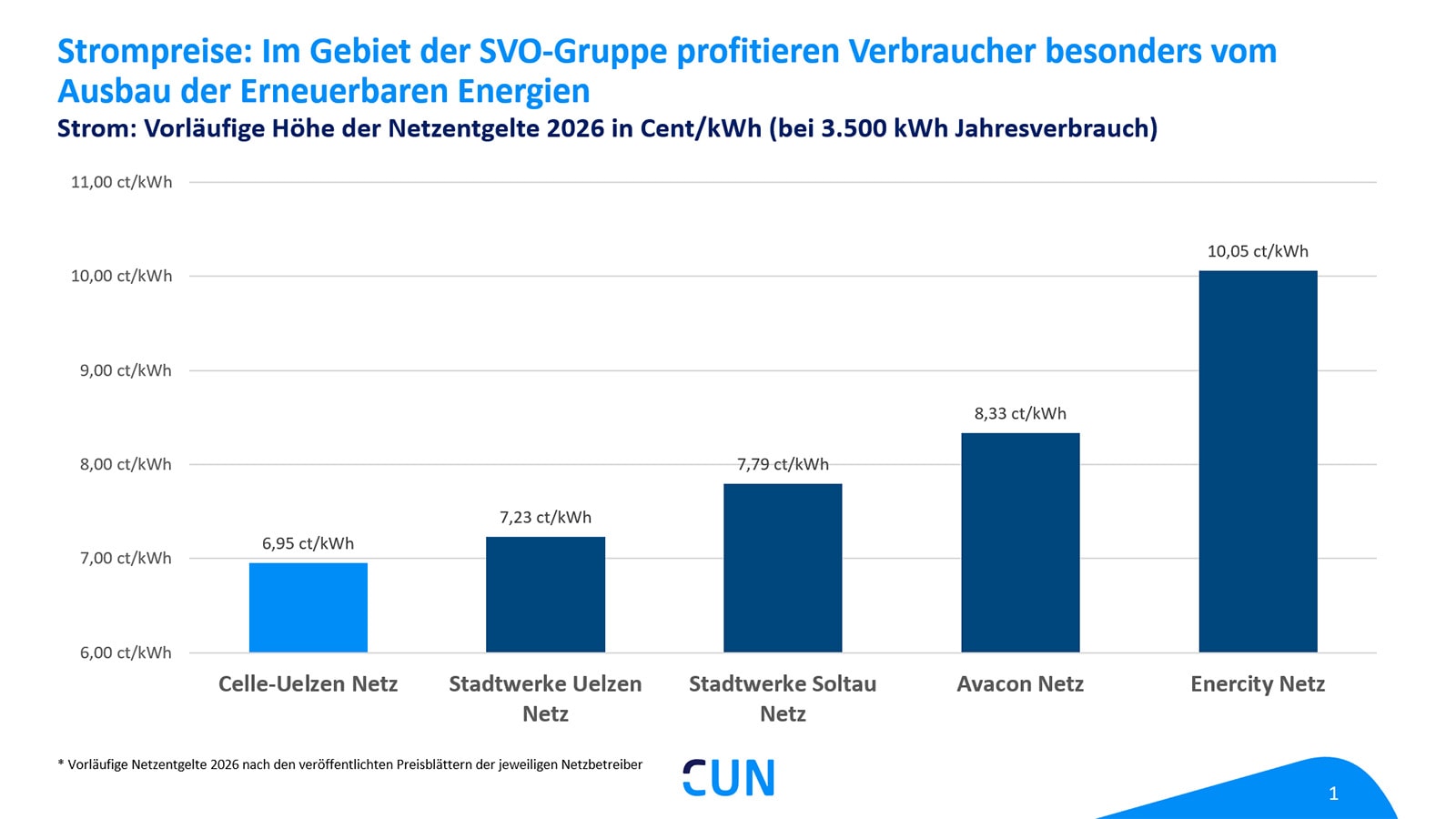 Die Celle-Uelzen Netz GmbH (CUN) kann als Strom-Netzbetreiber der SVO-Gruppe sehr niedrige Netzentgelte vorweisen. Das geht aus aktuellen Zahlen hervor. Hintergrund ist unter anderem, dass es in der Region einen hohen Anteil Stromerzeugung aus Erneuerbaren Energien gibt. Netzbetreiber wie die CUN werden für den damit verbundenen Aufwand entlastet – und können diese Vorteile weitergeben. Im Netzverbund der CUN profitieren städtische und ländliche Region gleichermaßen.